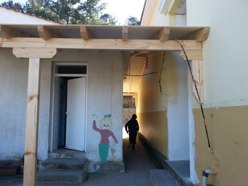 Unser Plan war es von Anfang an, den Abstand zwischen der neuen Tür und dem Toilettenhäuschen zu überdachen, damit die Kinder trockenen Fußes die Klos erreichen können. Das bedeutet aber eine Art „Anbau“ an das Schulgebäude. Ein Jahr hatte Polixeni Papamihail nun sich beharrlich durch die Mühlen der griechischen Bürokratie gekämpft. Immer wieder hat sie angerufen, nachgefragt, Emails versendet und mit Geduld und Ausdauer das Projekt zum Wettbewerb ausgeschrieben, Schreiner hergebeten, Gutachten und Vorschriften gelesen, Formulare ausgefüllt, Baupläne eingereicht, und so weiter. Es ging immerhin um die Bauerlaubnis für Veränderungen an einem öffentlichen Gebäude, an einer Schule wohlgemerkt, wo besondere Sicherheitsvorschriften gelten! Und die Mühlen mahlen langsam!